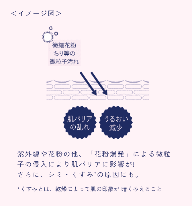 この微細花粉が肌に侵入すると、肌バリアが低下し、ザラツキ、ゴワツキの原因となります。